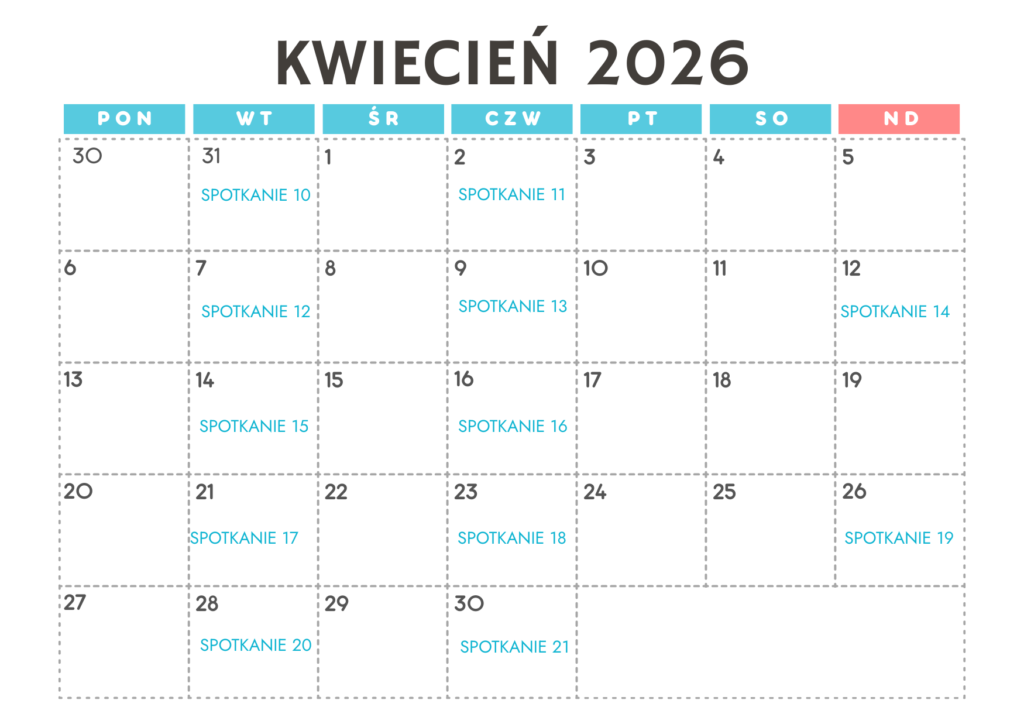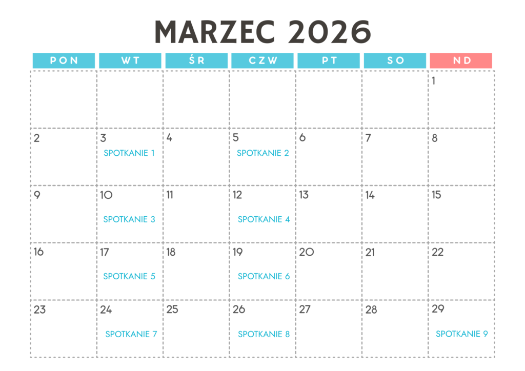 Kurs trwa od 26 lutego do 12 maja 2026 roku i jest w pełni online. Spotkania: wtorki, czwartki i wybrane niedziele, godz. 19:30.