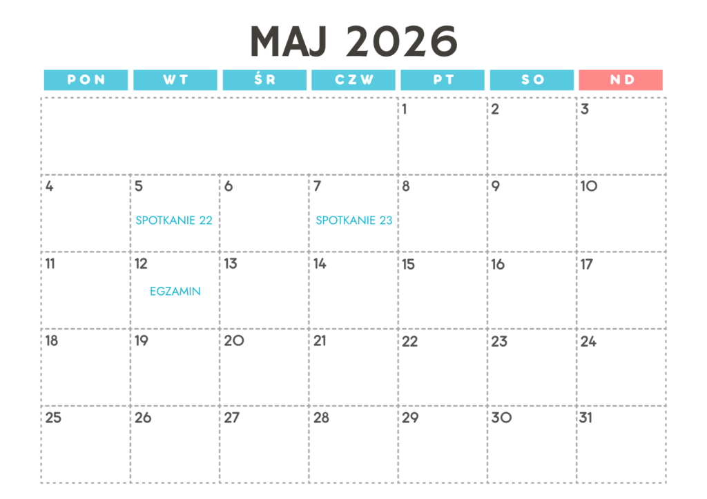 - Spotkania: dwa razy w tygodniu 60 minut, wtorki i czwartki, godz. 19:30 oraz dodatkowe zajęcia w wybrane niedziele 60 minut. W sumie 23 spotkania + spotkanie organizacyjne i egzamin.