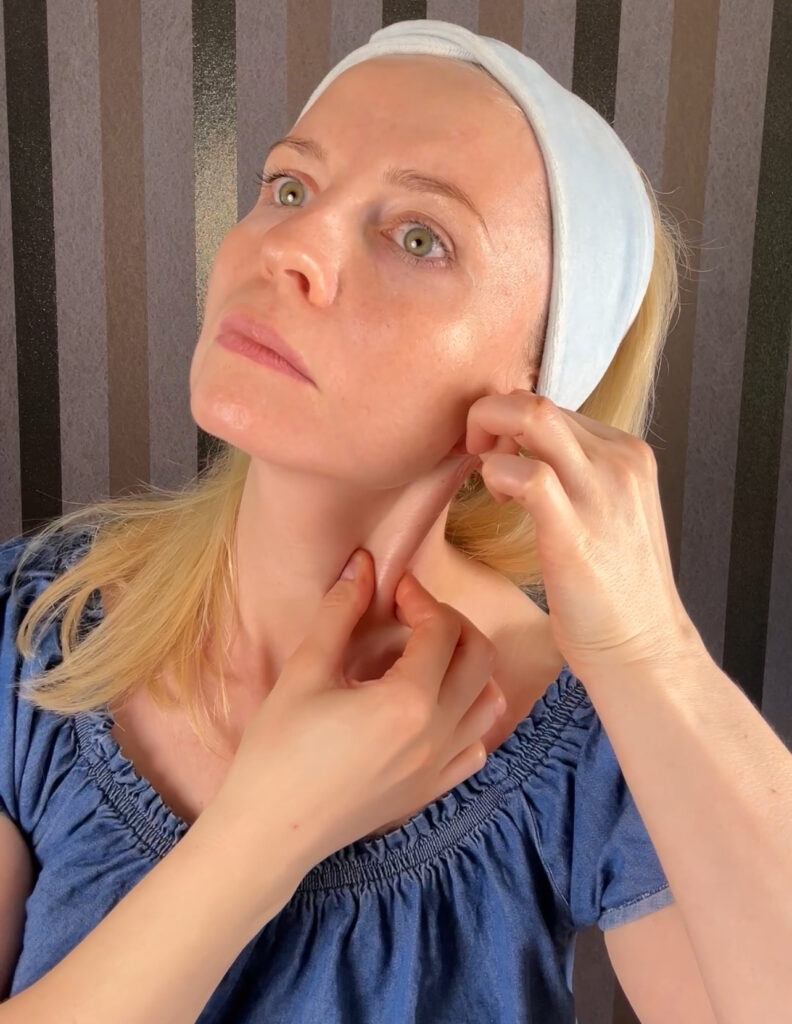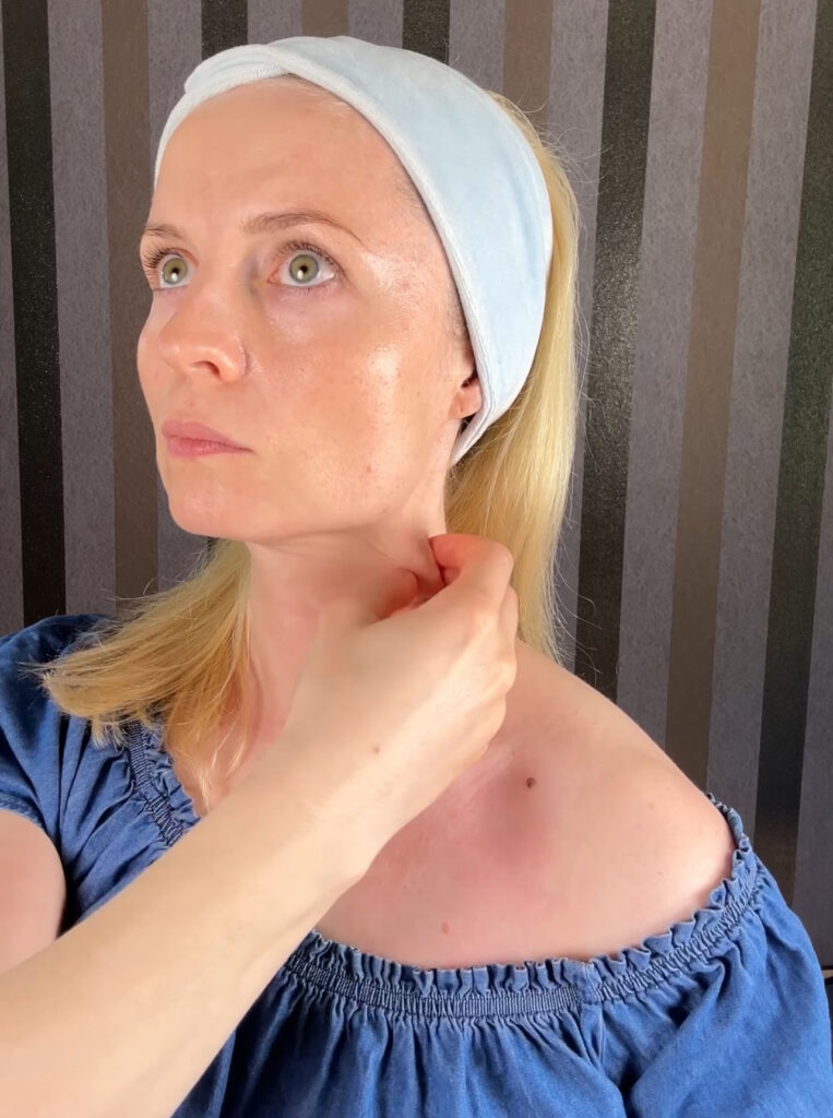 Tu zaczynamy pracę z mięśniem szerokim szyi, który w ogromnym stopniu wpływa na wygląd naszego owalu, podbródka i kątów ust.