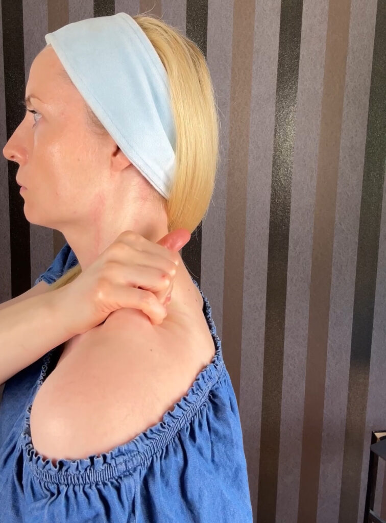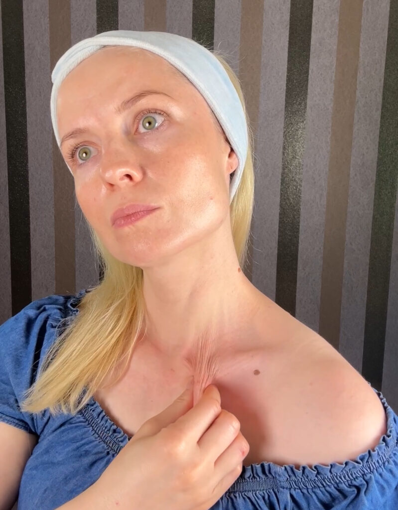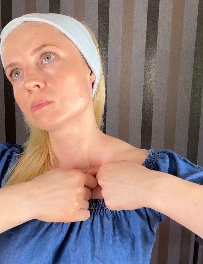 Jak masować: złap tkanki pod obojczykiem formując fałd i przesuwaj go wzdłuż obojczyka. Rób to spokojnie i uważnie. Powtórz 3-5 razy z każdej strony. Możesz powtarzać dwa – trzy razy w tygodniu, nie częściej niż co drugi dzień.